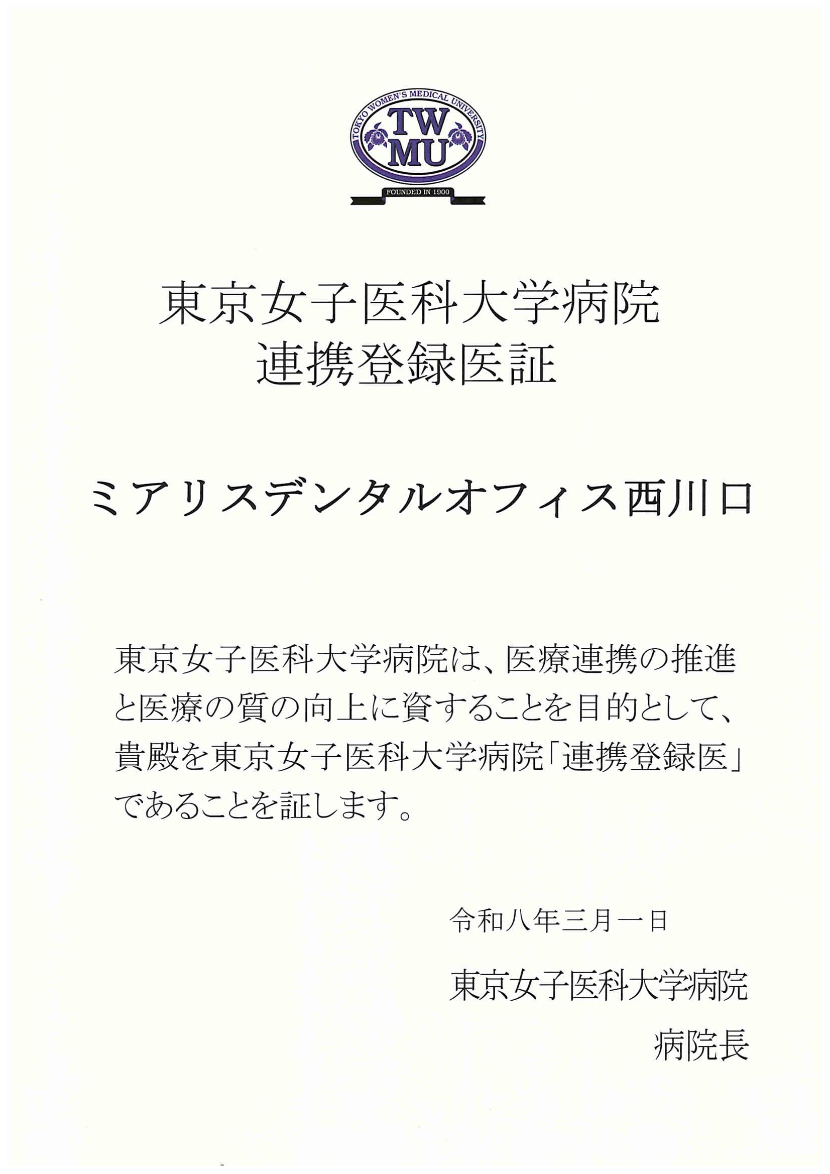この度、ミアリスデンタルオフィス西川口は、 東京女子医科大学病院と医療連携登録を行いました。